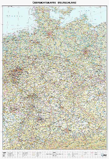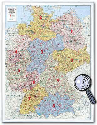 Organsiationskarte Deutschland - 1 : 700 000 98 cm x 129 cm Übersichtliche Organisationskarte Deutschland mit Angaben der zweistelligen Postleitzahlenregionen, Bundesländer, sowie Stadt-und Kreisgrenzen. Gut zu erkennen bei Klick auf die Karte