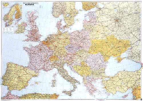F & B, Europakarte Politisch - 1 : 3,5 Mio. - Strassenverkehrskarte 124 cm x 88 cm Detaillerte Strassenkarte Europa mit guten Angaben zum Verkehrsnetz. Alle Autobahnen sind mit europäischer Kennzahl verzeichnet. Eine hohe Ortsdichte. Nordskandinavien ist mit einer Extrakarte eingeklingt. Vergrösserter Ausschnitt bei Klick auf die Karte.