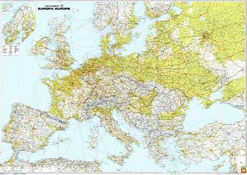F & B, Europakarte Politisch - 1 : 2,6 Mio.- Strassenverkehrskarte 170 cm x 120 cm Detaillerte Strassenkarte Europa mit guten Angaben zum Verkehrsnetz. Alle Autobahnen sind mit europäischer Kennzahl verzeichnet. Eine hohe Ortsdichte. Nordskandinavien ist mit einer Extrakarte eingeklingt. Vergrösserter Ausschnitt bei Klick auf die Karte.
