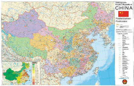 Postleitzahlenkarte China - 1 : 4 Mio. 134 cm x 87 cm Aktuelle Postleitzahlenkarte Chinas mit Einteilung nach Kantonen, Einteilung der Postleitgebiete, sowie Angaben zum Strassennetz (Stand Mai 2007), Internationalen Flughäfen und Seehäfen.