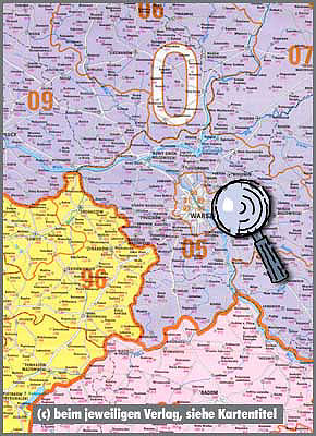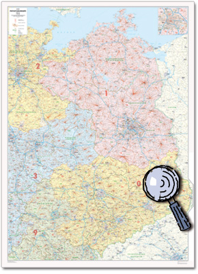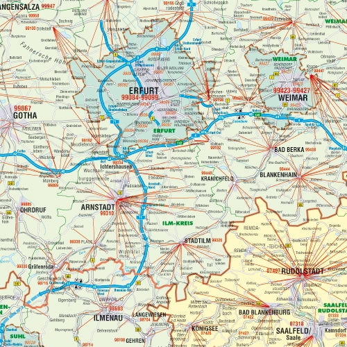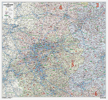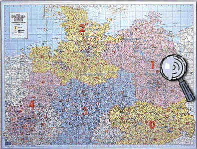 -Postleitzahlenkarte Nord-Ost 1 : 350 000 110 cm x 153 cm Neue Postleitzahlenkarte der neuen Bundesländer mit aktueller Darstellung der vollständigen PLZ-Gebiete durch sternförmige Darstellung. Darüber hinaus Land, Stadt- und Kreisgrenzen sowie Strassenbezeichnungen. Details bei Klick auf die Karte