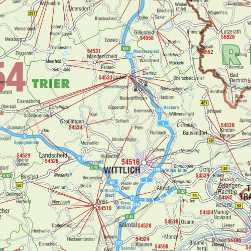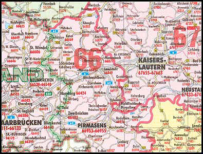 -Postleitzahlenkarte Rheinland-Pfalz 1 : 250 000 99 cm x 122 cm Neue Postleitzahlenkarte mit aktueller Darstellung der vollständigen PLZ-Gebiete durch sternförmige Darstellung. Darüber hinaus Land, Stadt- und Kreisgrenzen sowie Strassenbezeichnungen. Details erkennen Sie bei Klick auf die Karte