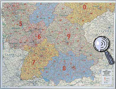Übersichtliche PLZ-Karte für Deutschland mit genauen Angeben der PLZ-Gebiete für jede Stadt und Gemeinde in Deutschland. (Gut zu erkennen bei Klick auf die Karte) Auch mit Firmeneindruck erhältlich !