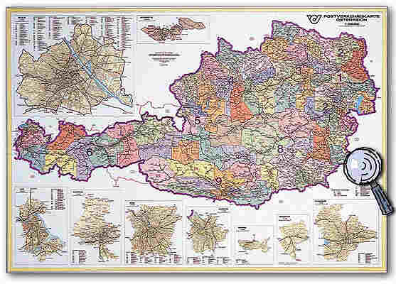 1 : 500 000 121 cm x 86 cm Aktuelle und übersichtliche Darstellung des Postleitsystems Österreichs. Jeder Ort ist mit der vollständigen Postleitzahl gekennzeichnet. Die Grosstädte sind durch Extra-Karten detailliert abgebildet. (Detail-Abbildung bei Klick auf die Karte)