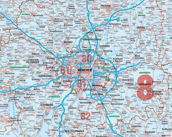 Neue Postleitzahlenkarte mit sternförmiger Darstellung der Ortsteile entsprechend den zugeordneten PLZ (Klick auf die Karte). Zusätzlich erhalten Sie mit einer Darstellung der Stadt, und Kreisgrenzen ein hochwertiges Produkt