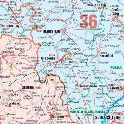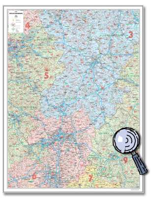 -Postleitzahlenkarte Hessen 1 : 250 000 98 cm x 130 cm Neue Postleitzahlenkarte mit aktueller Darstellung der vollständigen PLZ-Gebiete durch sternförmige Darstellung. Darüber hinaus Land, Stadt- und Kreisgrenzen sowie Strassenbezeichnungen. Details erkennen Sie bei Klick auf die Karte