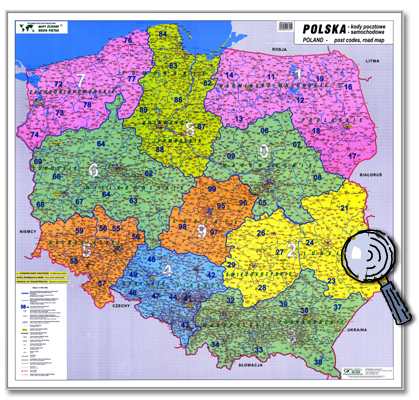 Eine aktuelle Postleitzahlenkarte Polen. Sehr übersichtlich und in der Planoversion mit Kunststoffleisten zur Aufhängung.