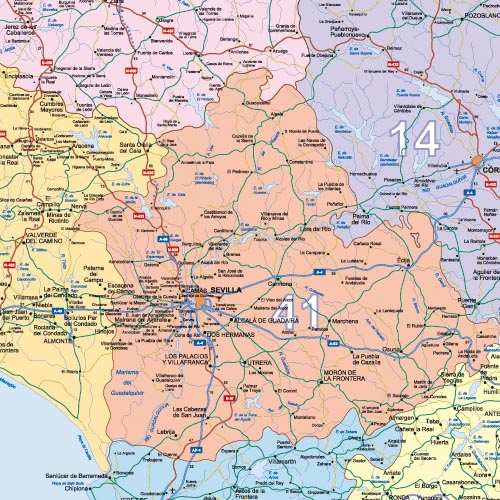 Neue Postleitzahlenkarte für Spanien mit farblicher getrennter Darstellung der zweistelligen PLZ-Gebiete, dichtem Ortsnetz und gekennzeichneter Autobahnen.