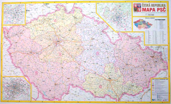 Postleitzahlenkarte Tschechien 1 : 440 000 115 cm x 73 cm Sehr detaillierte Postleitzahlenkarte für Tschechien mit zahlreichen Ortsangaben und den zugehörigen, vollständigen Postleitzahlen. Detailkarten für Prag, Ostrau und Brünn Vergrösserter Ausschnitt bei Klick auf die Karte